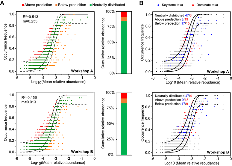 该项研究采用多组学技术系统分析了浓香型白酒糟醅发酵过程中关键微生物菌群的生态功能,明确了导致糟醅发酵过程中挥发性代谢物波动的优势微生物菌群;基于微生物相互作用网络的分析,构建了包含特征细菌和真菌相互作用的微生态网络,进而构建了一个包含优势菌群和关键菌群的合成群落,并提出精准调控浓香型白酒关键挥发性代谢物的策略;参考微生物生态学的中性模型,发现在人工干预和发酵条件控制过程中,关键微生物也可以影响品质稳定。