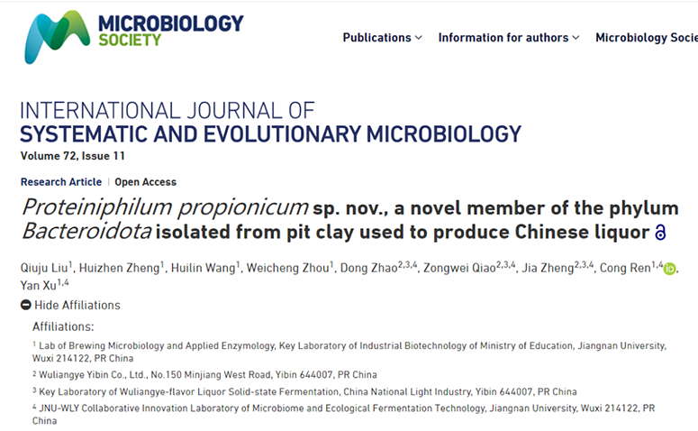 【中国白酒网】近日,五粮液股份公司技术团队联合江南大学徐岩教授团队联合攻关,从五粮液501酿酒车间654年窖龄的古窖泥中,于国际上首次发现一株拟杆菌纲全新菌种(代号JNU-WLY501,简称“501丙酸菌”)。该项研究成果Proteiniphilum propionicum sp. nov., a novel member of the phylum Bacteroidota isolated from pit clay used to produce Chinese liquor(丙酸嗜蛋白菌:一种分离自中国白酒生产窖泥的拟杆菌纲新成员)公开发表于国际原核微生物进化与分类学权威期刊《国际系统与进化微生物学杂志》(IJSEM)(全文链接:https://www.microbiologyresearch.org/content/journal/ijsem/10.1099/ijsem.0.005612)。