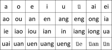 韵母有单韵母、复韵母、前鼻韵母、后鼻韵母组成。