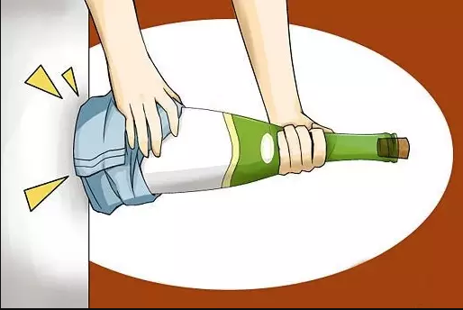 2、横着拿好酒瓶和缓冲物,找一面墙(如果是户外很可能是一棵树)用合适的力道有节奏的砸上去,如果没有这样的面,也可以把酒瓶倒着夹在自己的膝盖之间,找东西敲打酒瓶的底部。